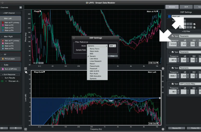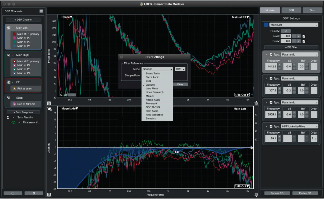 Smaart Data Modeler ist ein neues DSP-Modellierungssoftwaretool, mit dem Sie mithilfe von Pegel-, Entzerrungs-, Polaritäts- und Timing-Anpassungen eine virtuelle Audiosystemausrichtung und -optimierung durchführen und die Auswirkungen dieser Anpassungen auf Smaart-Messdaten anzeigen können. In Zusammenarbeit mit Eclipse Audio ist Smaart Data Modeler in der Lage, Filtertopologien für bestimmte DSP-Geräte zu modellieren, sodass Sie verschiedene Filtereinstellungen anwenden und die summierte Reaktion mehrerer Messkurven in der Vorschau anzeigen können, bevor Sie diese Einstellungen an DSP übertragen. Wenn Ihr DSP ein unterstütztes Gerät eines Drittanbieters ist und über ein kompatibles Dateiexportformat in Data Modeler verfügt, können Sie diese Einstellungen von DM direkt auf Ihr Gerät importieren. Für nicht unterstützte Geräte steht ein generischer DSP-Modus zur Verfügung und Einstellungen können manuell vorgenommen werden.